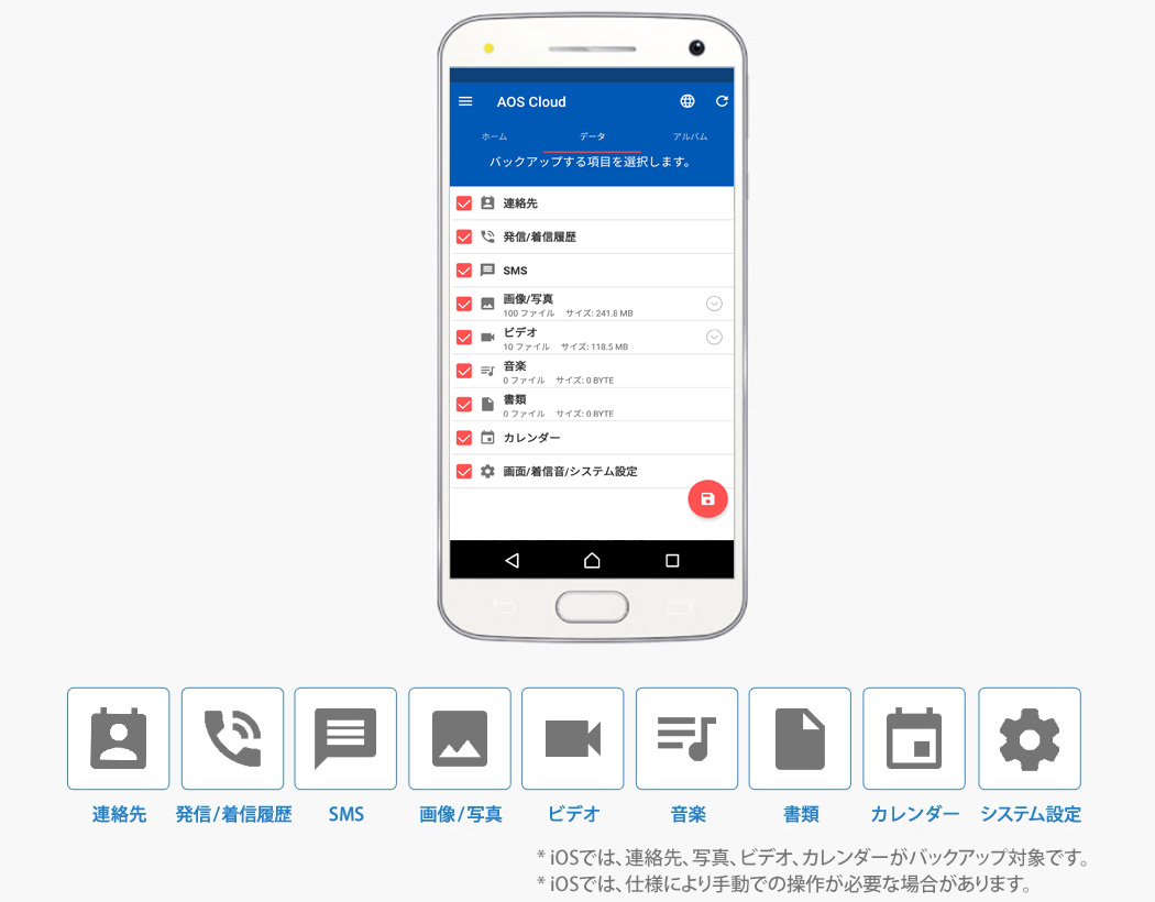 画像、音楽、書類などのアイコンをタップするだけの簡単設定で、毎日自動でバックアップが始まります。あなたのAndroidやiPhoneの中の連絡帳、写真、動画などをAOS Cloudが全自動でクラウド上に管理します。