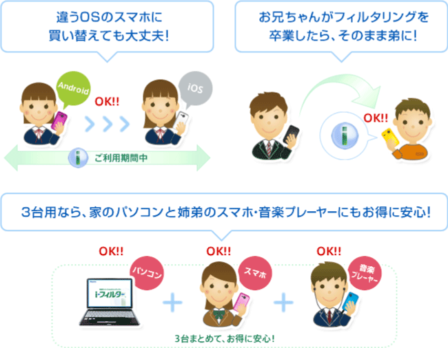 利用期間中であれば同じOSはもちろん、Windows、iOS、Android、いずれの異なるOSにもご利用端末を変更できます。お子さまのスマホを買い替える時も、OSを気にする必要はありません!また複数台プランなら、ご利用端末3台まで同じシリアルで管理できるので便利!